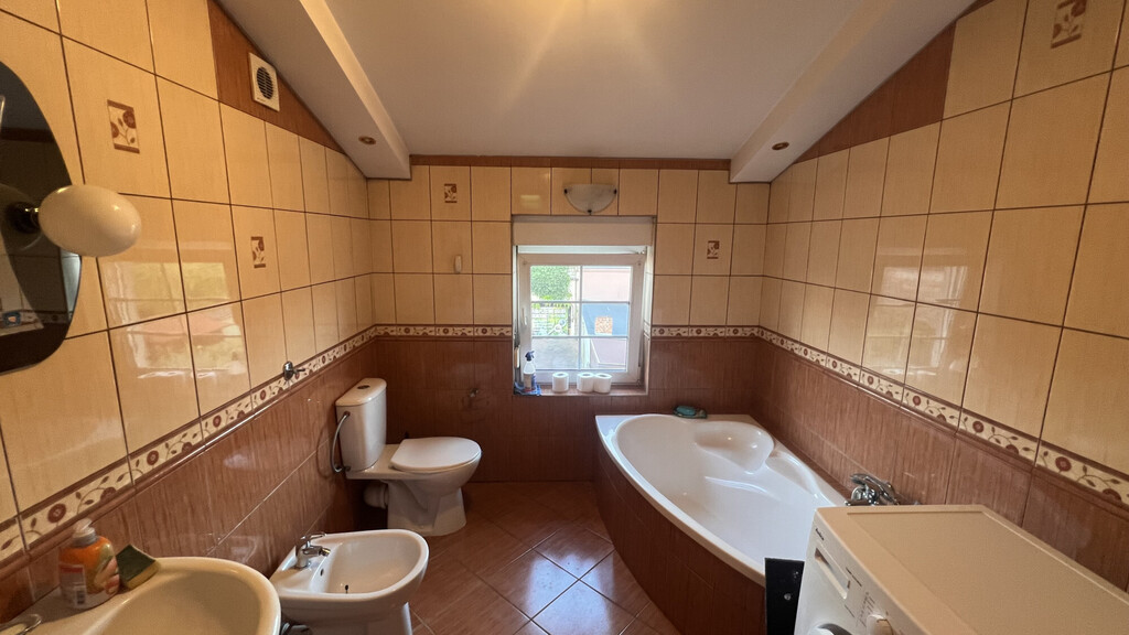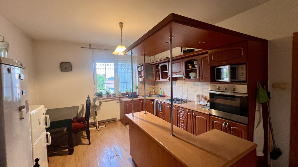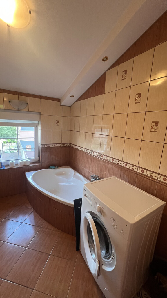 2 łazienki, wc, 5 pokoi, 2 kuchnie ,aneks kuchenny, pomieszczenia sklepowe, pralnia, garaż z poddaszem oraz wiatą. Dojazd z dwóch stron.