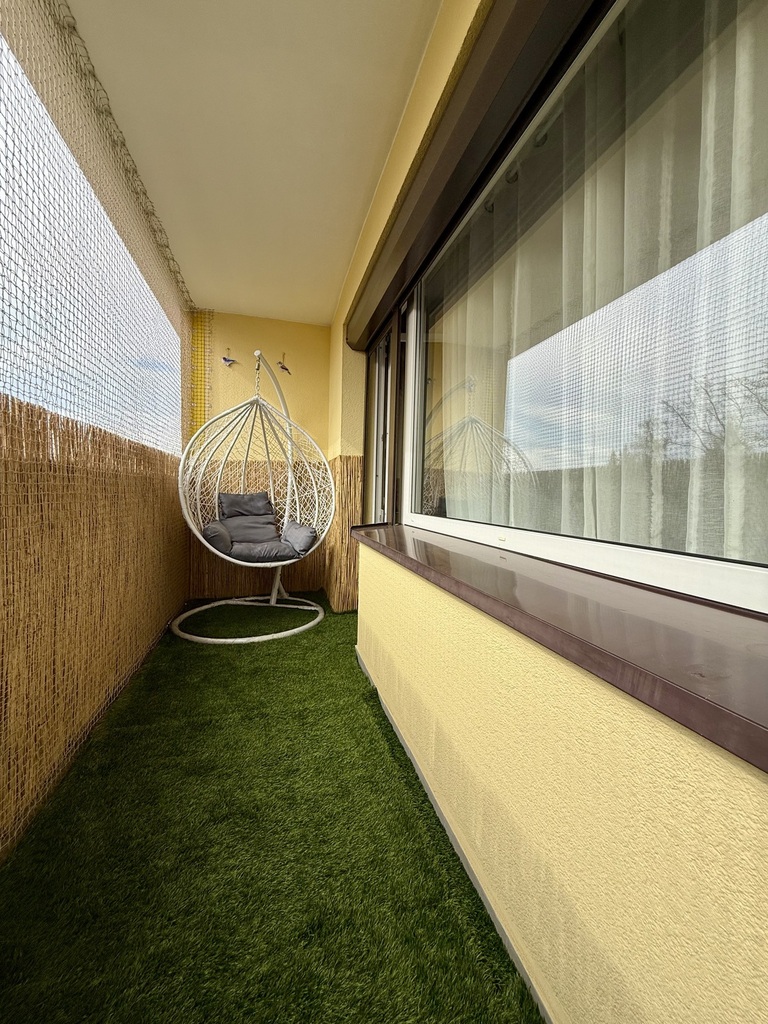 Na balkonie znajduje się huśtawka typu kokon z poduszkami oraz sztuczna trawa, co tworzy przyjemną przestrzeń do relaksu.