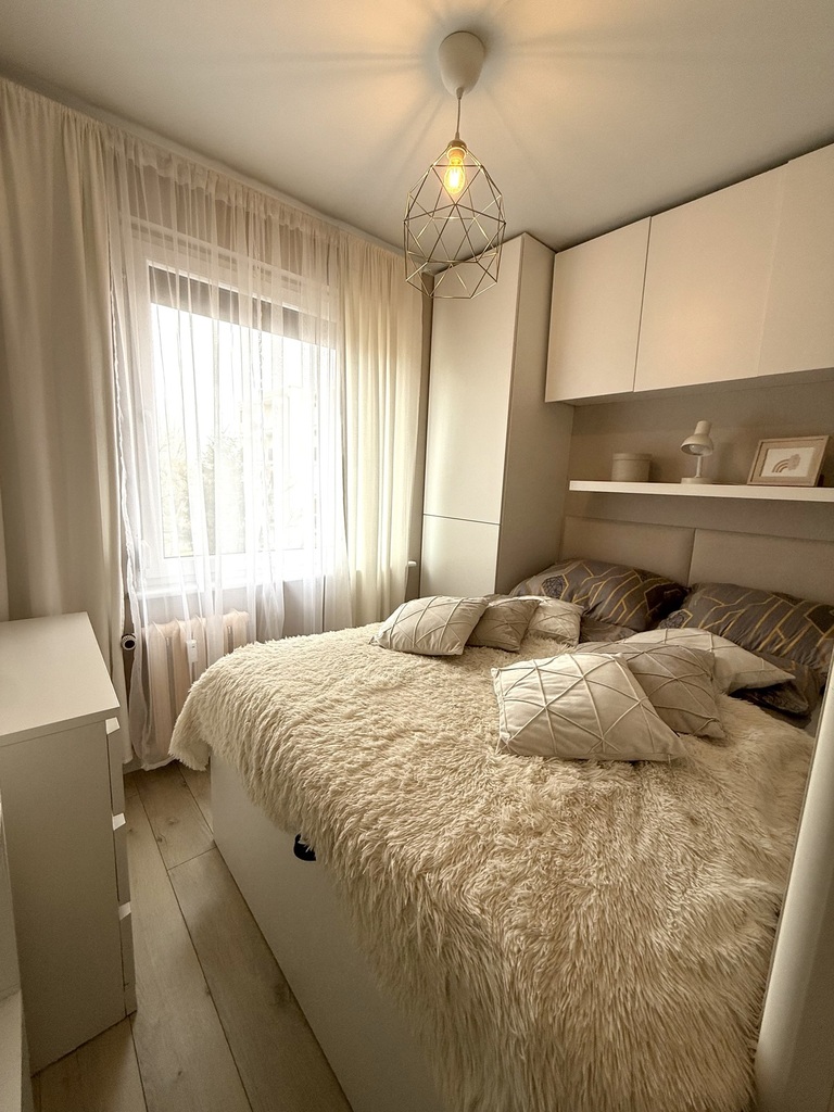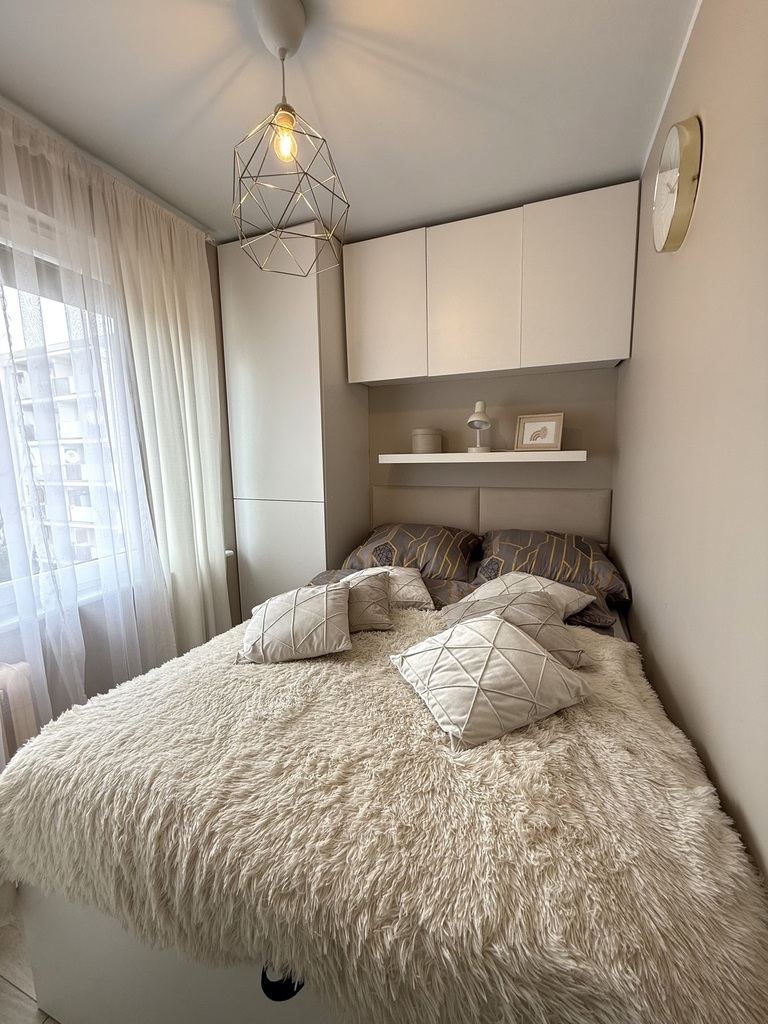 - sypialnia: łóżko ze schowkiem, szafa, komoda, regał