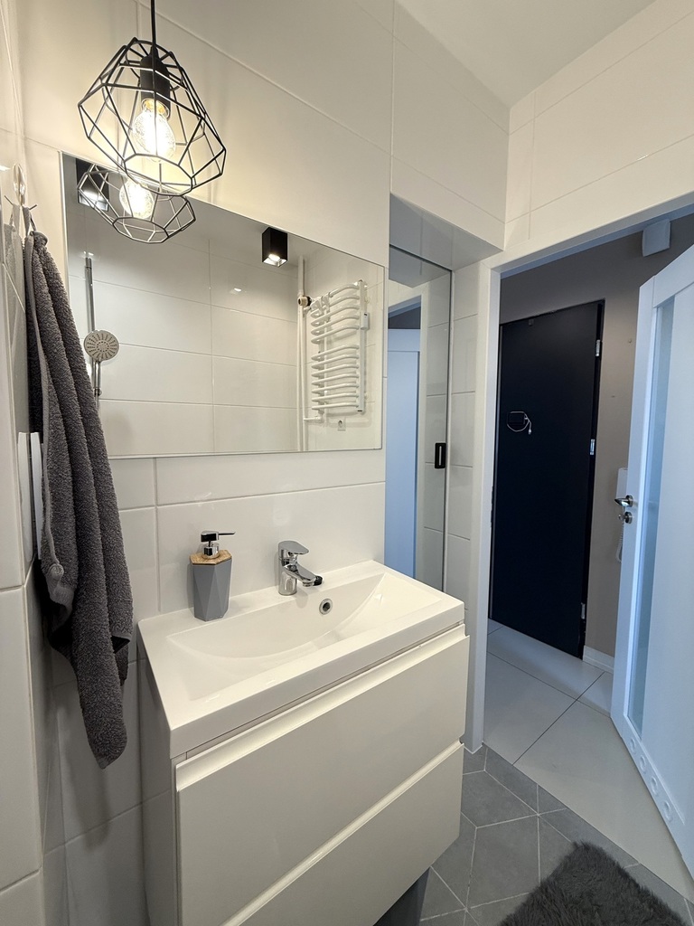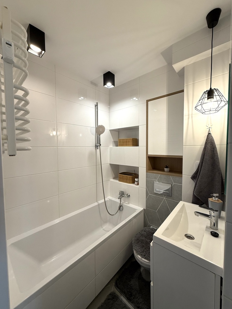 - łazienka: wanna, szafka wnękowa z osobnym schowkiem, w którym mieści się nowa pralka