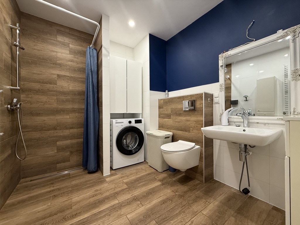 - Łazienka z pralką i kabiną prysznicową